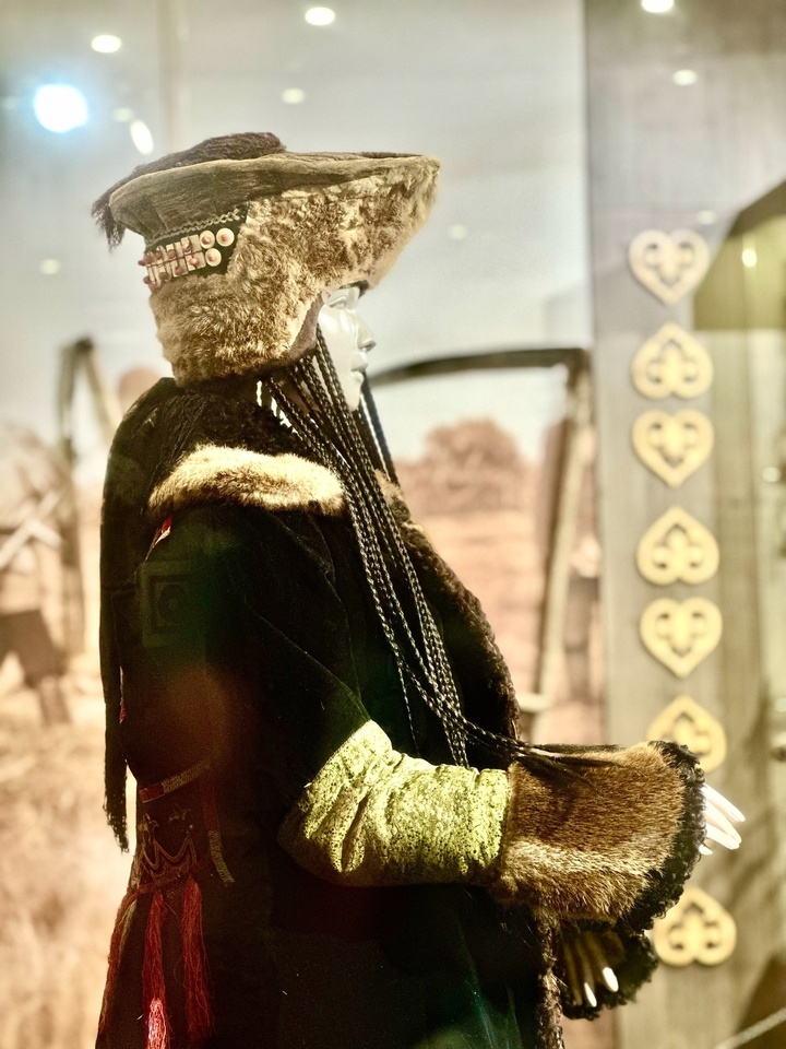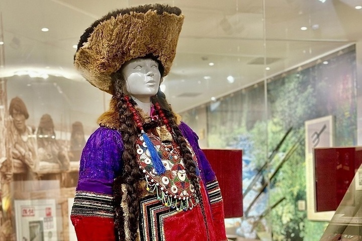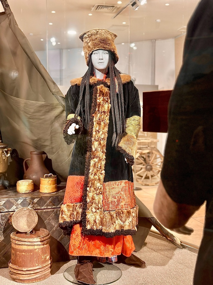 В феврале уникальные артефакты наконец-то вернулись в столицу Хакасии. Сейчас их можно увидеть в одном из залов главного музея республики. Экскурсоводы рассказали, что хакасская свадебная шуба сшита из черной мерлушки, воротник сделан из меха выдры и мерлушки. Покрыта шелком фиолетового цвета с жаккардовым рисунком. Края полы и подола опушены мехом выдры и собольими лапками. Создавали ее вручную в 19 веке.