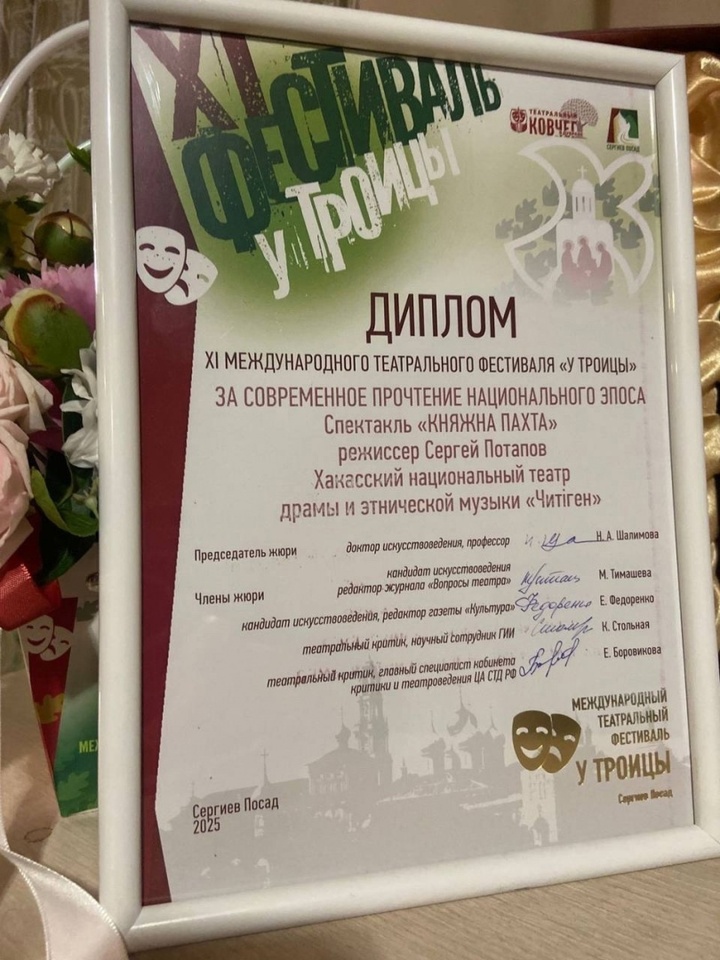 Коллектив Хакасского национального театра драмы и этнической музыки «Читiген» наградили дипломом за современное прочтение эпоса в спектакле «Абахай Пахта» («Княжна Пахта», 12+) А. Чапрая.