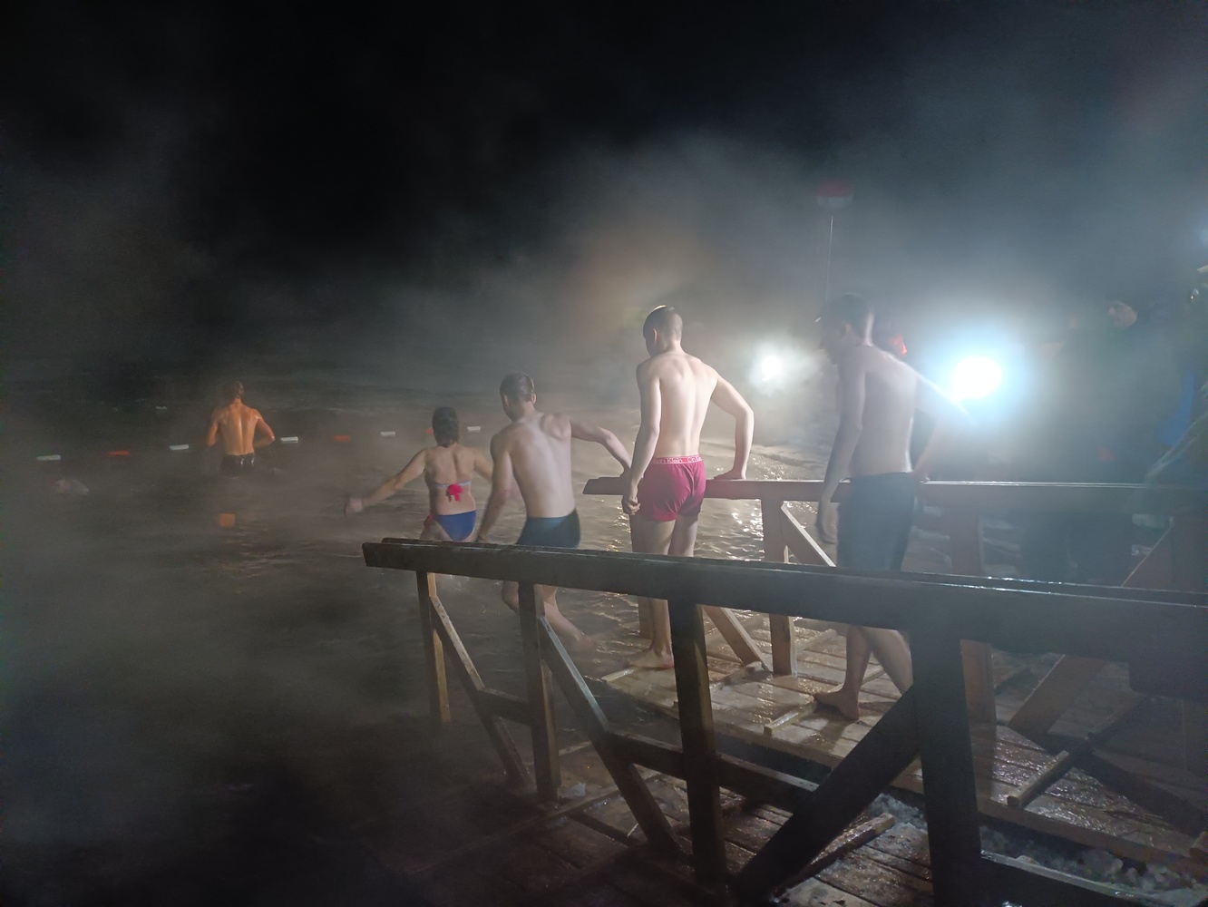 Люди понемногу подходили к костру в ожидании праздника и с каждой минутой их становилось больше. Священнослужители освятили воду, после чего участники купаний погрузились в дренажный канал.
