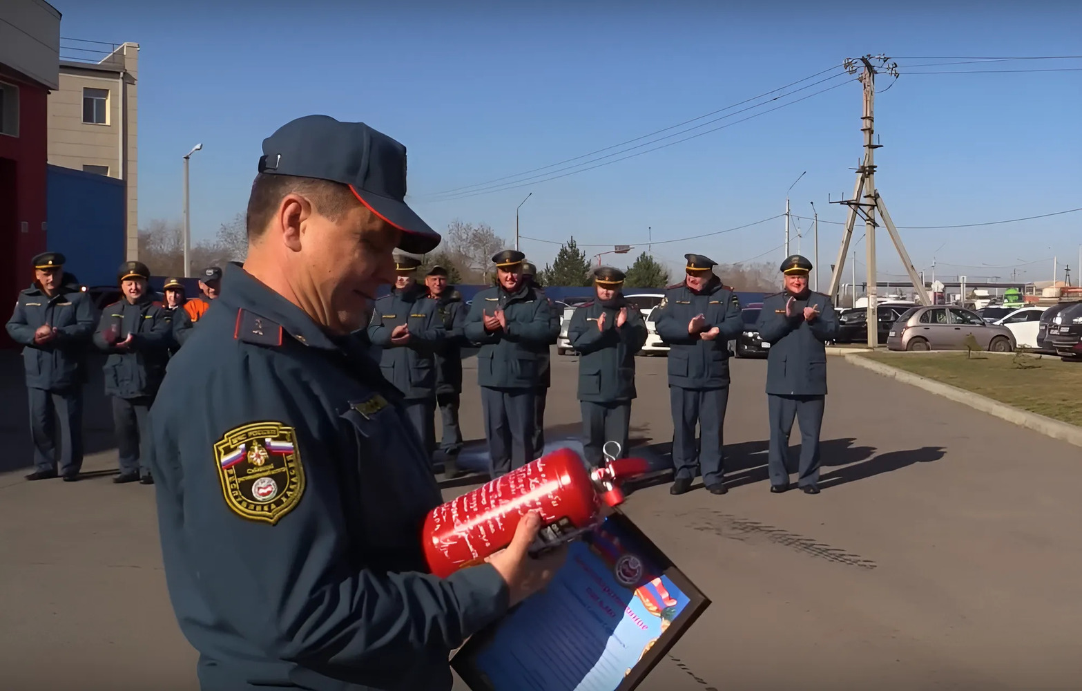 Проводить на заслуженный отдых коллегу пришли руководящий состав Главного управления, коллеги из пожарно-спасательного отряда и части, дежурный караул. Перед строем Сергею Милкину зачитали приказ о его увольнении по достижению предельного возраста и подарили подписанный коллегами огнетушитель.