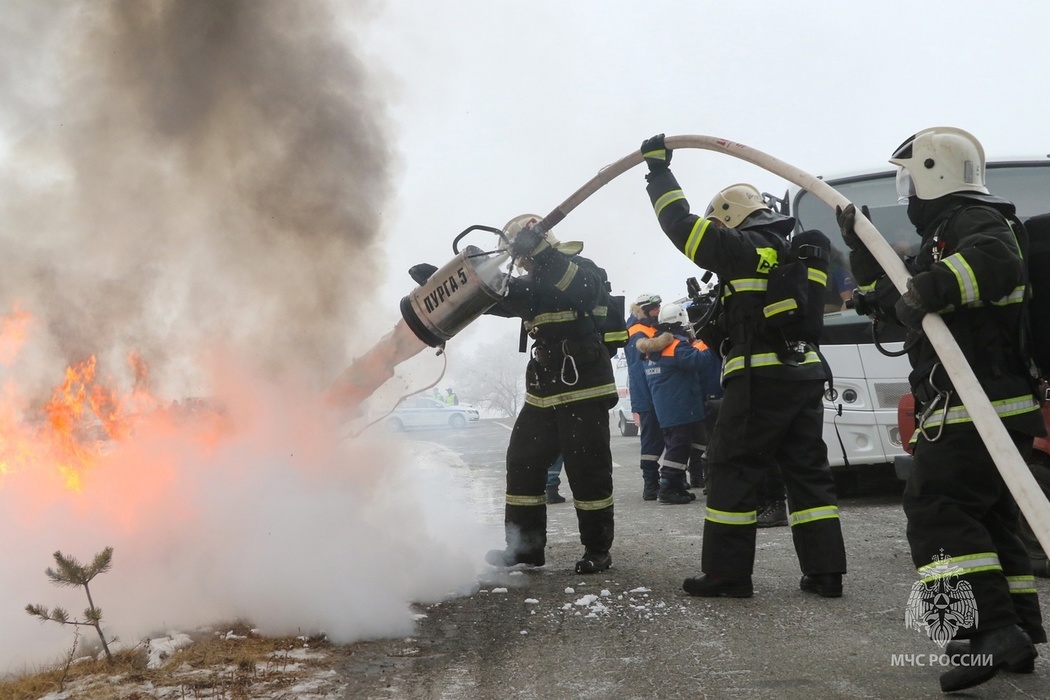 Пожарные устроили пенную атаку для тушения горящего топлива и вытащили водителя легковушки. Представители Южно-Сибирского поисково-спасательного отряда МЧС России эвакуировали условных пострадавших из автобуса и бензовоза.