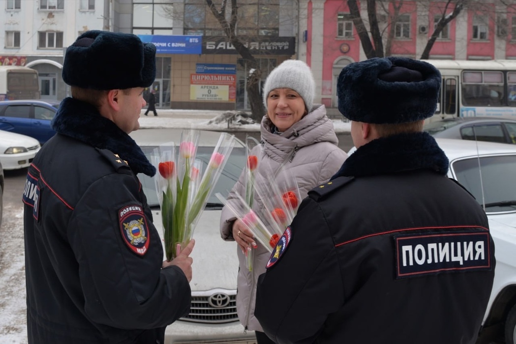 Полицейские Хакасии поздравили женщин на улицах Абакана с наступающим праздником