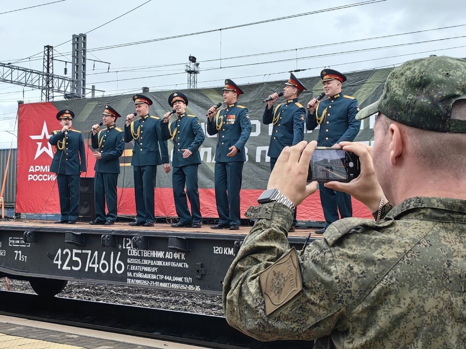 Сегодня же на перроне, как они себя назвали «хоть в форме, но мы парни обыкновенные» исполнили фронтовые и современные военные песни, лихие казацкие мелодии и любимые композиции не одного поколения: от «Смуглянки» и «Песенки фронтового шофера» до «Трава у дома» и «Триста тридцать три».