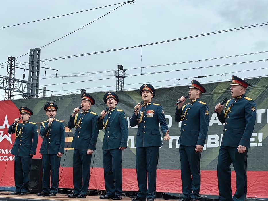Сегодня же на перроне, как они себя назвали «хоть в форме, но мы парни обыкновенные» исполнили фронтовые и современные военные песни, лихие казацкие мелодии и любимые композиции не одного поколения: от «Смуглянки» и «Песенки фронтового шофера» до «Трава у дома» и «Триста тридцать три».