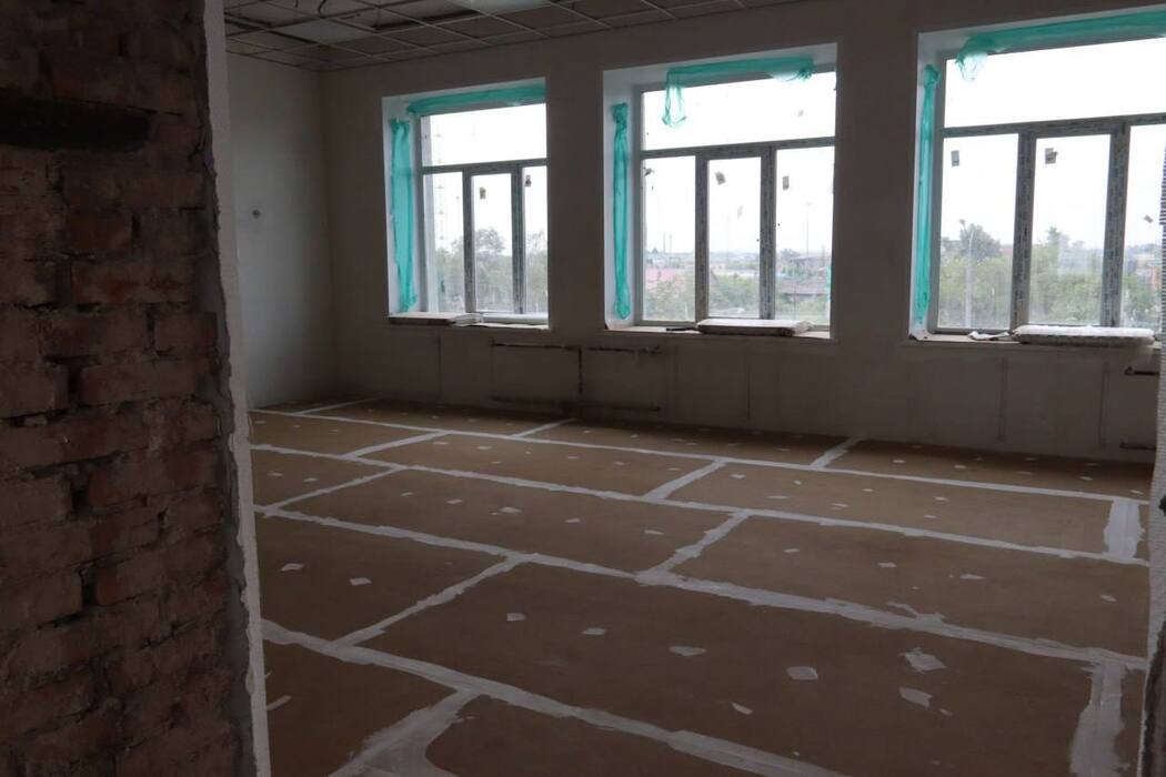 Так, на третьем этаже шпатлюют коробы под вентиляцию, оклеивают стеклообоями, начали шпатлевать полы под линолеум. На втором монтируют противопожарные двери и подвесные потолки. Параллельно делают каркас деревянных полов и сцены в актовом зале, укладывают плитку в пищеблоке, монтируют системы водоснабжения и водооотведения, оклеивают стеклообоями классы.