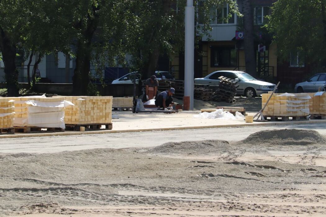 «Предстоит выложить 2100 квадратных метров брусчатки, работы идут ежедневно. В сутки рабочие укладывают примерно 200 «квадратов». Параллельно заполняют швы на уже выложенных участках. По контуру установим бордюрный камень», – рассказал начальник участка Роман Плевако.
