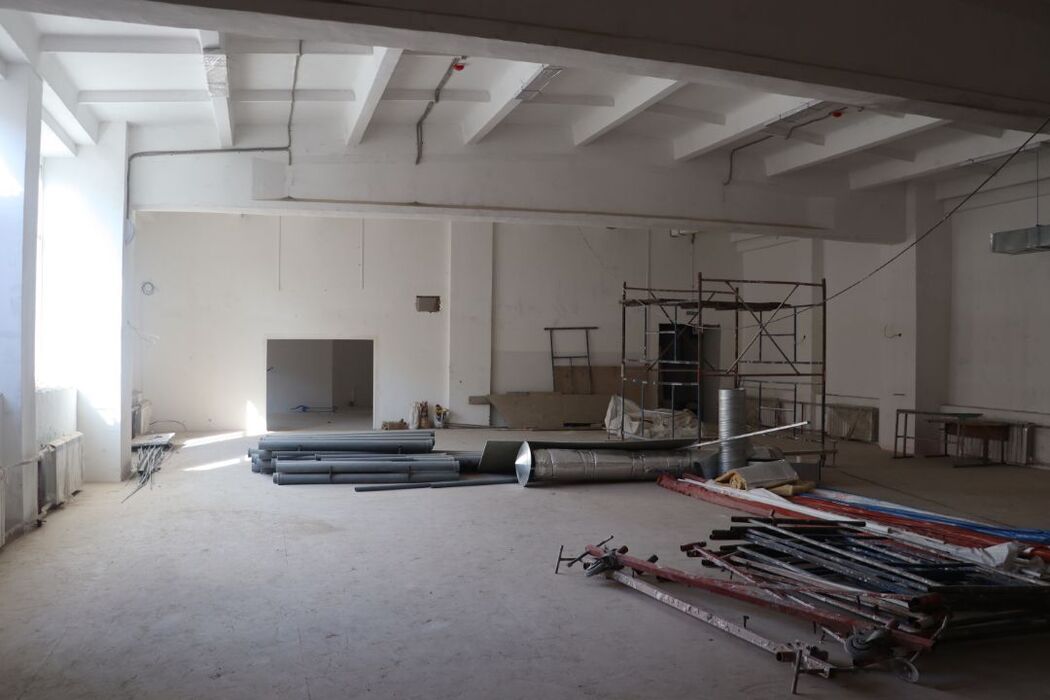 Сейчас основные работы идут на первом этаже. Здесь завершают отделку дверных проемов, оклеивают стены обоями. В спортзале монтируют спецпокрытие для пола, в пищеблоке уже уложили керамическую плитку и залили пол.