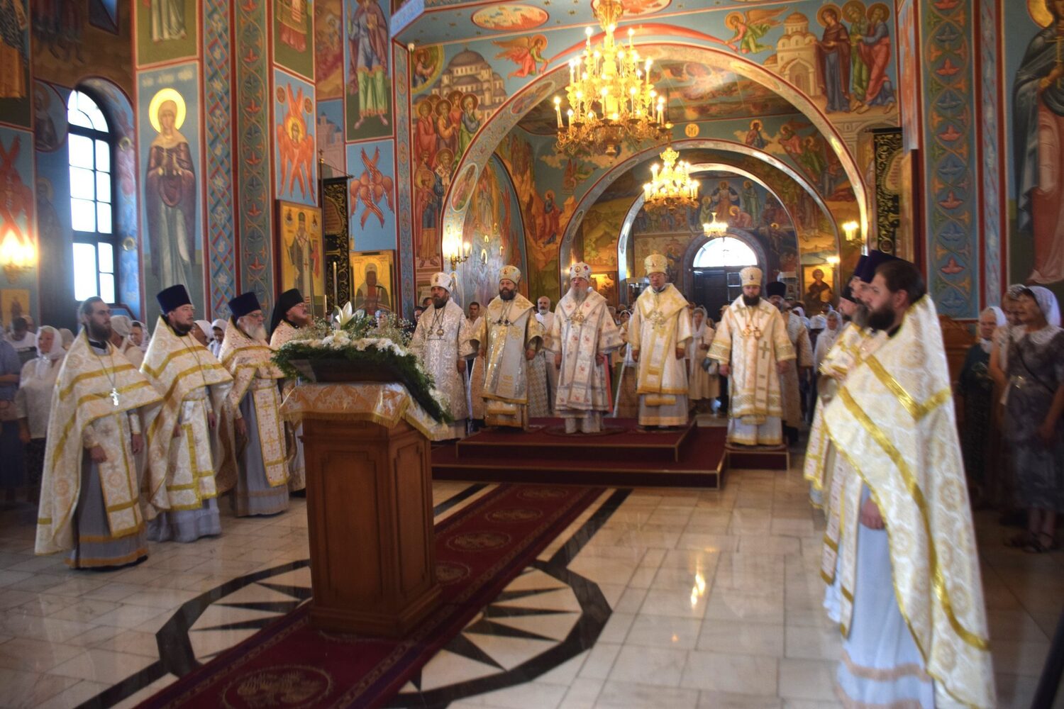 Богослужение возглавили митрополит Красноярский и Ачинский Никита, архиепископ Абаканский и Хакасский Ионафан, архиепископ Корейский Феофан, епископ Енисейский и Лесосибирский Игнатий и епископ Минусинский и Курагинский Серафим.