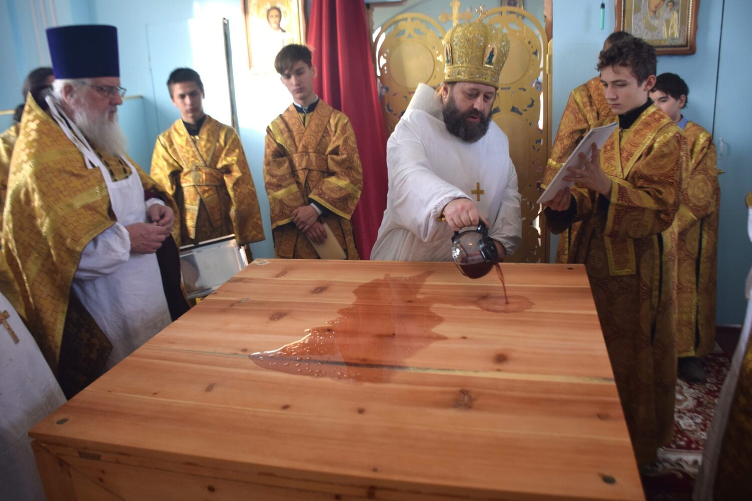Чин освящения храма начался с кропления престола святой водой и чтения молитв на утверждение престола. После его омыли водой и вином, смешанным с розовой водой, освятили молитвой, помазали святым миром и облачили. Также освятили антиминс и жертвенник. Стены храма помазали святым миром и окропили святой водой.