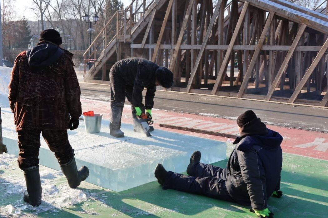 Подрядчик Олег Даровских рассказал, что в этом году заготовка льда для гор шла с особенностями: из-за погоды лед в водоемах нарастает не так быстро. Поэтому ледовые блоки нарезали на Калининском карьере и в абаканской зоне отдыха. Для создания всех украшений потребуется тысяча ледовых блоков размером метр на два.
