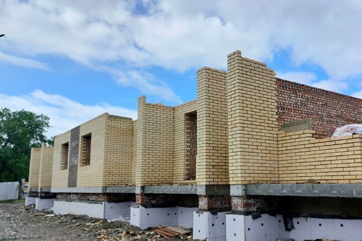 Рабочие уже сделали фундамент, протянули коммуникации и приступили к укладке первого этажа.