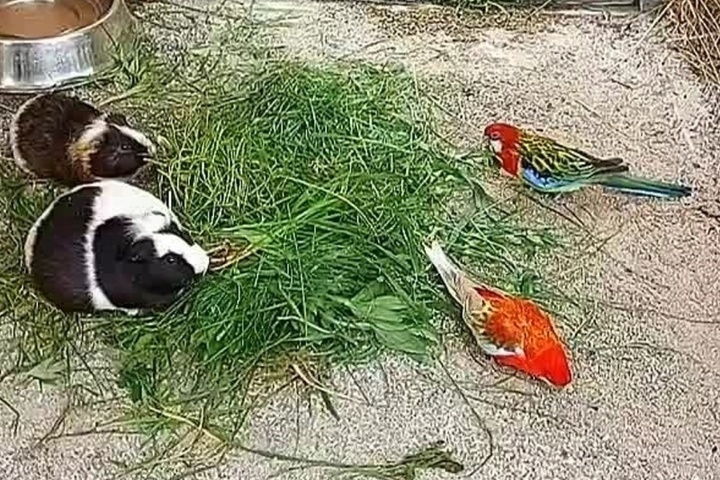 Морские свинки общительные и дружелюбные, поссориться могут только со своими сородичами за лакомый кусочек, а попугаи розеллы – миролюбивые, любопытные и не агрессивные.