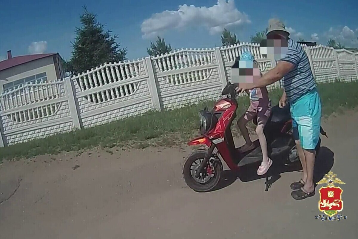 Житель Красноярска нарушил правила безопасности в курортном поселке Жемчужный. Мужчина ехал с семилетней внучкой на мопеде, когда их заметил патруль ДПС.