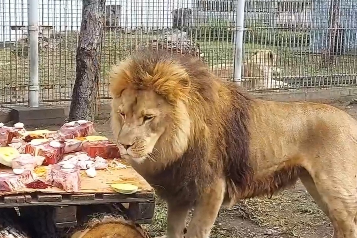 В честь праздника льву Лемику из Абаканского зоопарка подготовили особенный обед. Сначала он решил поиграться с коробкой и мешком, однако не добрался до лакомств, находящихся в них. Затем приступил к трапезе и съел мясной торт.