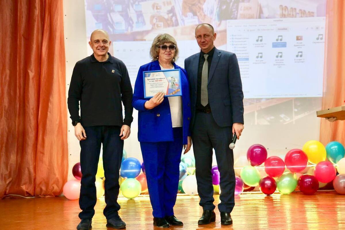 Политик поздравил школу с победным дублем и лично вручил сертификат на сумму 500 тысяч рублей.
